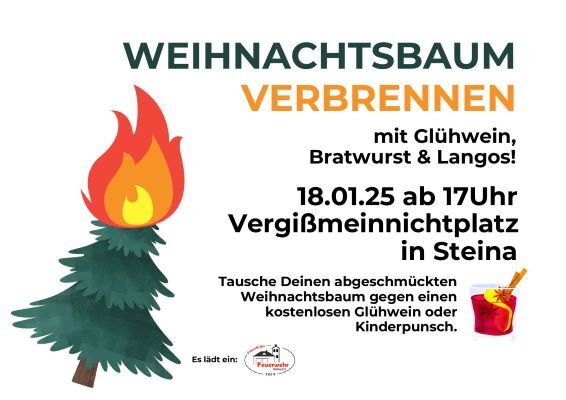 Wir haben da eine Idee! Kommt am Samstag, den 18. Januar 2025 auf den Vergißmeinnichtplatz zum Weihnachtsbaumbrennen, Beginn 17.00 Uhr. Im Tausch gegen Euren, natürlich abgeschmückten Weihnachtsbaum, gibt es einen Glühwein oder Kinderpunsch gratis.
