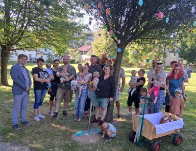 Am Sonntag, dem 10.09.2023 fand bei herrlichstem Sonnenschein der Empfang für die Kinder, die im Jahr 2022 geboren wurden, statt. Bürgermeister, Sandro Bürger betonte, dass es ihm ein großes Anliegen ist, zusammen mit den Eltern und Familienangehörigen unsere kleinen „Neusteinaer“ in unserer Gemeinde willkommen zu heißen. Es ist zu einer schönen Tradition geworden, die Namen und Geburtstage der geborenen Kinder auf einer Tafel zu verewigen. Die Tafeln stehen vor Bäumen, in dem Fall vor einer Zierkirsche. Dies hat Symbolcharakter. So wie sie wachsen, sollen auch die Kinder in unserer Gemeinde heranwachsen und Wurzeln schlagen. Die Geburt eines Kindes ist ein wunderbares Ereignis für eine junge Familie, aber auch für die Gemeinde. Die Kinder sind unsere Zukunft und wir wollen, dass sich junge Familien bei uns wohlfühlen. Dafür wird alles getan. Die Kinder der Kita „Zwergenland“ hatten ein sehr schönes Programm einstudiert, mit dem sie die kleinen Steinaer begrüßten. Recht herzlichen Dank an die Kinder und Erzieherinnen.
