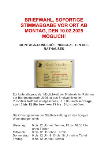 Die Stimmzettel liegen voraussichtlich ab dem 10. 02.2025 der Stadtverwaltung Pulsnitz vor.