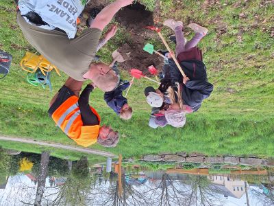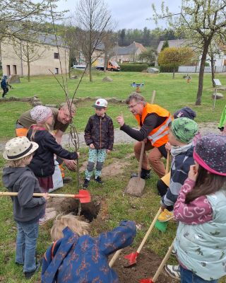Am 15.04.2025 war es nun soweit. Die Vorschulgruppe pflanzte gemeinsam mit dem Bürgermeister, Herrn Bürger und dem Bauhofmitarbeiter, Herrn Groth die Bäume und Sträucher auf dem Kroneplatz. Unsere kleinen, fleißigen Helfer unterstützten den Bürgermeister tatkräftig beim Einpflanzen und Angießen der Gehölze und hatten viel Spaß und Freude daran. Herr Bürger stellte den Kindern in Aussicht, dass die Bäume und Sträucher nun wachsen und gedeihen können und bald Früchte tragen werden, die die Kinder dann ernten können. Vielen Dank an die Vorschulgruppe und die Erzieherinnen Frau Christoph und Frau Kaiser.
