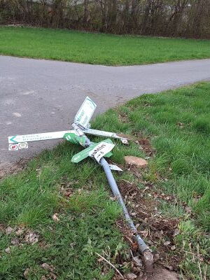 In der Zeit vom Montag, den 14.4.25, von 18.30 Uhr bis Dienstag, den 15.4.25, 6.30 Uhr kam es zu einem Unfall auf der Straße Zum Haustein. Ein Fahrzeug fuhr den in der Kurve stehen Mast mit Hinweisschildern um und beging Fahrerflucht. Es erfolgte eine Anzeige bei der Polizei.