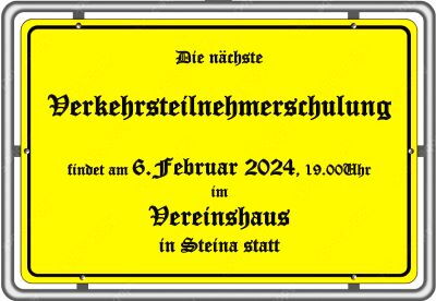 Die nächste Verkehrsteilnehmerschulung findet am 6. Februar 2024, 19.00 Uhr im Vereinshaus, Hauptstraße 64 in Steina statt. Die Schulung ist öffentlich. Wir hoffen auf ein reges Interesse.