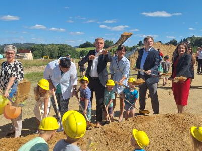Das Schönste war, dass sie gemeinsam mit den Großen den offiziellen Spatenstich an ihrer neuen Einrichtung vollziehen durften. Der Landtagsabgeordnete Aloysius Mikwauschk und Landtagskandidatin Elaine Jentsch hatten dafür Kinderspaten mitbracht.