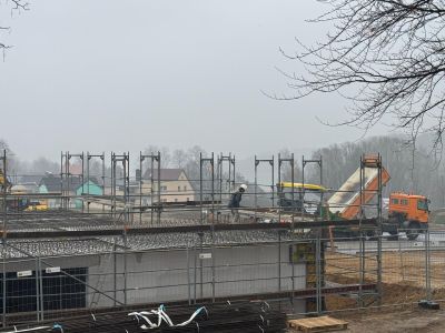 Die Arbeiten am Obergeschoss sind im April fristgemäß voran geschritten. Die Straße wurde abgenommen und die Parkflächen hergestellt.